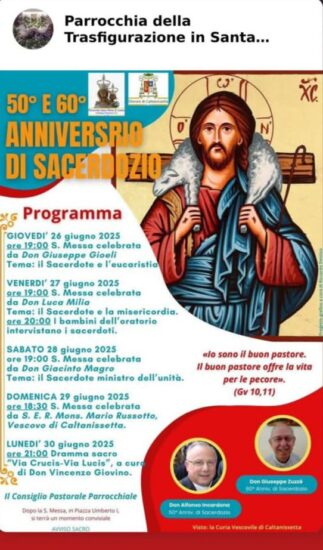 MUSSOMELI – Anche un bel gruppetto di Mussomelesi è stato presente a Vallelunga Pratameno a festeggiare i due anniversari sacerdotali ricadenti nella giornata del 29 giugno per la festa dei Santi Pietro e Paolo: i 60 anni di sacerdozio del vallelunghese Padre Giuseppe Zuzzè e i 50 di vita sacerdotale di Padre Alfonso Incardona, attuale arciprete di Vallelunga e già arciprete-Parroco di Mussomeli. Ed è questo suo buon ricordo, fra la gente, la stima, l’ammirazione dei parrocchiani mussomelesi che hanno voluto fare sentire la loro vicinanza con la loro presenza in questa fausta ricorrenza per gioire assieme a lui per il dono del sacerdozio. Una celebrazione solenne presieduta dal vescovo mons. Mario Russotto e con la partecipazione del presbiterio. Il giorno successivo, i festeggiati sono stati omaggiati, ancora, con la rappresentazione di musical con in scena un gruppo ragazzi e ragazze, guidati da don Vincenzo Giovino, Parroco della “Trasfigurazione” di Mussomeli. I ringraziamenti, il finale momento di convivialità e l’abbraccio conclusivo hanno colorato un momento di socialità che profuma soprattutto di amicizia.