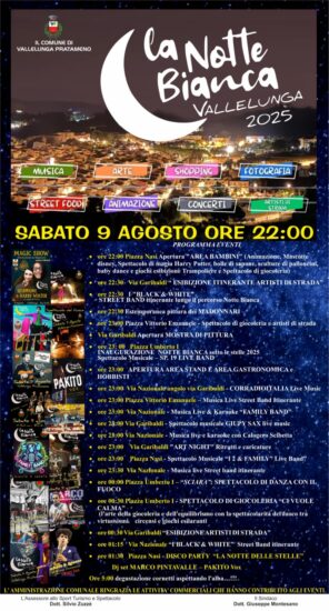 VALLELUNGA PRATAMENO – Domani sera la cittadina vallelunghese si illumina con la notte bianca organizzata nell’ ambito della programmazione dell’ estate Vallelunghese, a partire dalle ore 22:00. Dj set, live band, spettacolo del fuoco, spettacoli di magia, street food, musica, artisti di strada, animazioni e tanto altro.Vallelunga Pratameno diventa un grande centro di attrazione per tutti, con un vasto programma di eventi con intrattenimenti e animazioni per tutti i gusti e palati. Musica, luci ma anche sapori così da creare un divertimento multisensoriale. Un mare di musica, colori, divertimento ed emozioni sotto il cielo stellato di Vallelunga Pratameno.