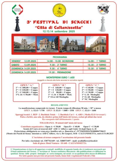 Dal 12 al 14 settembre, presso la sala convegni dell’Hotel Ventura, si terrà il 3° Festival di Scacchi “Città di Caltanissetta”, organizzato dall’ASD L’Alfiere.