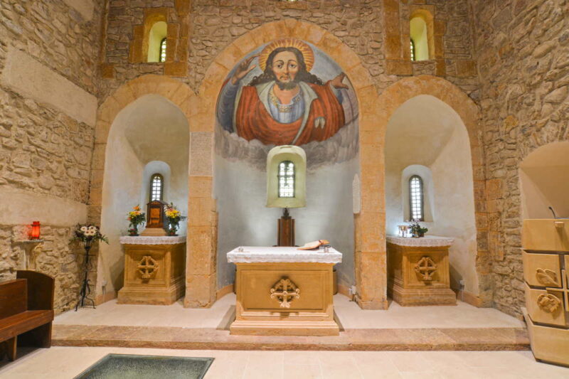 All’esterno, l’edificio presenta una navata unica triabsidata, con una proporzione longitudinale pari a tre volte la larghezza trasversale. Il numero tre, che ritorna anche nelle tre finestrelle absidali disposte con assi convergenti verso un unico punto centrale, richiama il mistero dell’unità trinitaria. Lo stesso simbolismo si ritrova sopra l’area presbiteriale, dove altre tre finestrelle, attraversate dalla luce solare, amplificano l’intensità spirituale del luogo.