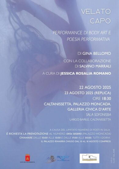 La performance ideata e realizzata da Gina Bellomo con la collaborazione di Salvino Marrali e a cura di Jessica Rosalia Romano, è patrocinata dal Comune di Caltanissetta e dalla ProLoco Caltanissetta e si svolgerà il prossimo 22 e 23 agosto alle ore 18.30 nella Sala Sofonisba di Palazzo Moncada.