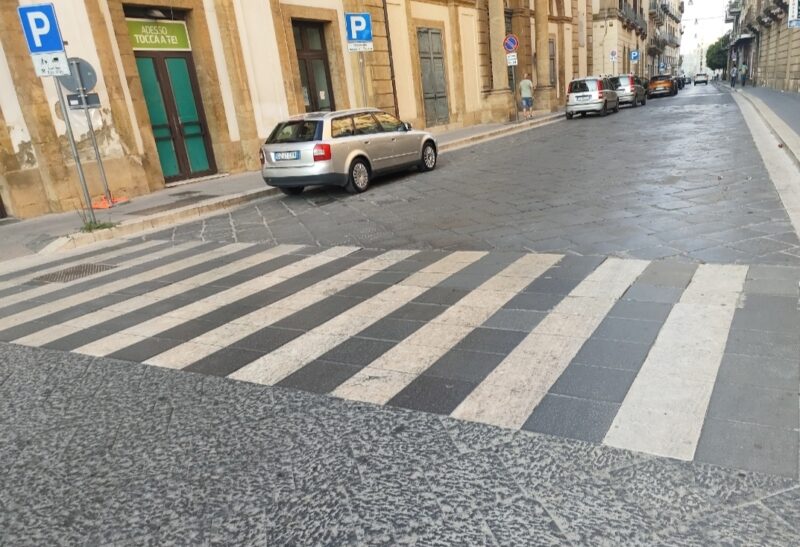 L’unica eccezione riguarda il centro storico, dove gli attraversamenti pedonali coincidono con basole di pietra lavica, come in via Maddalena Calafato o lungo Corso Vittorio Emanuele. In particolare, quelli che da Piazza Garibaldi attraversano verso Corso Vittorio Emanuele, realizzati già molti anni fa durante i lavori di riqualificazione della Grande Piazza, utilizzano pietra lavica proveniente dall’area etnea. Qui la visibilità è rimasta inalterata nel tempo, senza bisogno di ritocchi.
