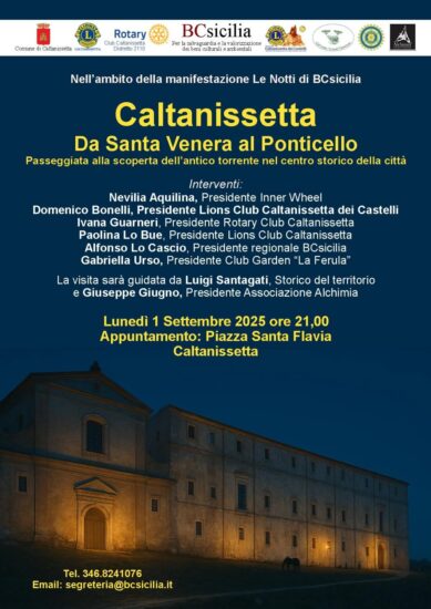 La manifestazione, che rientra nella rassegna “Le Notti di BCsicilia”, è in programma per lunedì 1 settembre 2025 alle ore 21.00, con partenza da piazza Santa Flavia. Durante la serata interverranno i rappresentanti delle principali associazioni cittadine: Nevilia Aquilina, presidente Inner Wheel, Domenico Bonelli, presidente del Lions Club Caltanissetta dei Castelli, Ivana Guarneri, presidente del Rotary Club Caltanissetta, Paolina Lo Bue, presidente del Lions Club Caltanissetta, Alfonso Lo Cascio, presidente regionale di BCsicilia, e Gabriella Urso, presidente del Club Garden “La Ferula”.