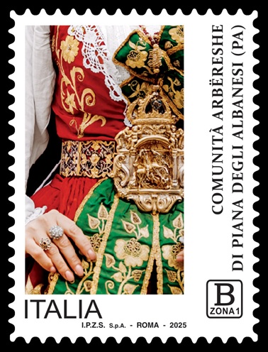 Oggi è stato emesso un francobollo dedicato ad una della più antiche ‘minoranze’ d’Italia, la Comunità arbëresche di Piana degli Albanesi (Palermo). Il francobollo (che è valido per la posta ordinaria spedita in Europa e nel Mediterraneo) riproduce un particolare di un caratteristico abito folkloristico ispirato alla cultura e alle tradizioni locali.