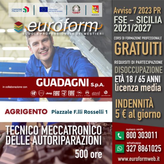 Agrigento, martedì 5 agosto 2025 – Due realtà d’eccellenza del panorama siciliano uniscono le forze per costruire opportunità concrete di crescita e valorizzazione del territorio. Euroform, Scuola Professionale dei Mestieri, e Guadagni Spa, azienda storica dell’automotive e partner del gruppo Stellantis, danno ufficialmente il via a una partnership strategica per promuovere il nuovo corso gratuito di Tecnico Meccatronico delle Autoriparazioni finanziato dalla Regione Sicilia nell’ambito dell’Avviso 7/2023 PR FSE – Sicilia 2021/2027.