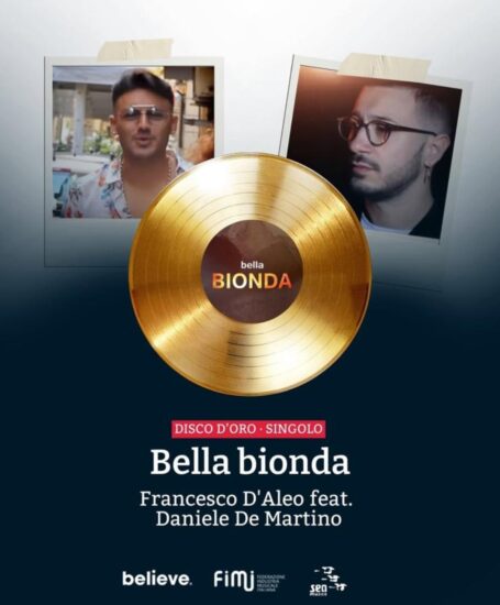 Il successo di Francesco D’Aleo ha trovato conferma anche nei riconoscimenti ufficiali. Il suo brano “Bella bionda”, in collaborazione con Daniele De Martino, ha ottenuto la certificazione di Disco d’Oro, rilasciata dalla FIMI in collaborazione con Believe e Sea Musica. Un traguardo importante, raggiunto senza mai essere trasmesso dalle radio nazionali, ma solo grazie alla forza del passaparola digitale, ai social e all’affetto del pubblico.