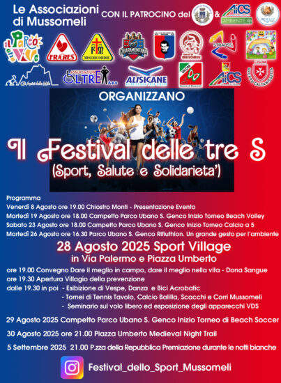 MUSSOMELI – Sarà stasera, alle ore 19 presso la biblioteca comunale, l’appuntamento a cui parteciperanno sedici associazioni per la presentazione del nutrito programma sportivo dal titolo “Il festival delle tre S (Sport, salute e solidarietà che si svolgerà nelle prossime 12 giornate di questo mese alternativamente fra il parco urbano “Salvatore Genco”, la via Palermo e Piazza Umberto. Va detto che a memoria d’uomo non si ricorda una simile programmazione prolungata dove si svolgeranno attività sportive e si terranno convegni, a cui sono interessate tante associazioni. Aics Ambiente, e Pro Loco:Il parco che vive” la Fratres, la Misericordia, la Chiaramontana, l’asd Don Bosco, Vespisti di Mussomeli, Strauss, Smile for life, gli Amici della Mtb, Oltre, Alisicane, Uildm sezione di Mussomeli, Aics presidenza provinciale di Agrigento e Cisom – Gruppo di Caltanissetta. C’è il patrocinio del comune di Mussomeli
