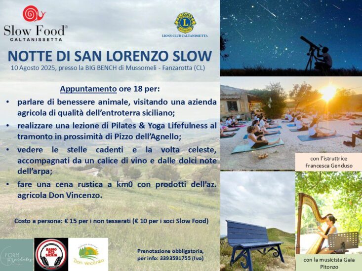 Il Lions Club Caltanissetta, guidato dalla presidente Paola Lobue, è tra i partner di un evento unico organizzato da Slow Food, in collaborazione con l’Azienda agricola Don Vincenzo e Francy Pilates.