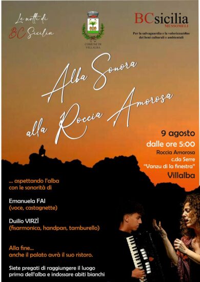 VILLALBA – Un appuntamento all’alba previsto per il 9 agosto, dalle 5 alle 9 alla “Roccia Amorosa” di Villalba indossando abiti bianchi. Lo rendono noto i promotori BC Sicilia di Mussomeli e l’Amministrazione comunale di Villalba. “Ci sono luoghi che ci chiamano e non ne conosciamo la ragione… … sono sirene ammantate di vento alla cui malìa non si deve resistere perché, forse, cedendo alla loro bellezza potremmo trovare la via che porta alla Grande Gioia”. L’alba sonora alla Roccia Amorosa ci attende all’alba lasciandoci incantare dal mito, dalla musica di Duilio Virzì e dal canto di Emanuela Fai. Un’esperienza unica e suggestiva che vedrà madre e figlio uniti da un cordone musicale. Un viaggio che combina la musica contemporanea con la tradizione del sud Italia evocando nenie che cullano l’anima di chi ascolta, creando un’atmosfera emozionale e coinvolgente. Inoltre le composizioni inedite del giovane Duilio Virzì sembrano essere un esempio di come la creatività possa essere coltivata e valorizzata fin da giovane. L’omaggio alla tradizione del Sud Italia aggiunge un tocco di autenticità e radici culturali. Un viaggio musicale che ci accompagnerà dalle prime luci del giorno fino al sorgere del sole e ci farà vivere un’esperienza emotiva e spirituale, dove natura e cultura si fondono insieme.