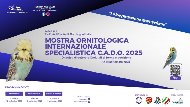 Il Club Amici dell’Ondulato è lieto di annunciare l’imminente Mostra Ornitologica Specialistica C.A.D.O. 2025, che si terrà dal 12 al 14 settembre 2025. si conferma un evento di riferimento a livello europeo. Il Club Amici dell’Ondulato (CADO) celebra la 33ª edizione con un risultato eccezionale: la partecipazione record di oltre 800 soggetti provenienti da tutta Italia e dall’estero. Questo traguardo consolida la sua posizione come la seconda mostra più importante d’Europa dedicata all’ondulato.