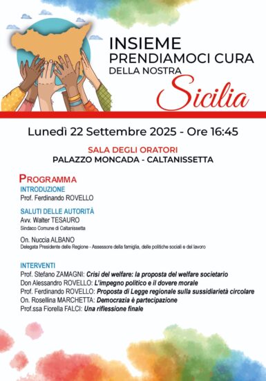 Un evento di notevole rilevanza politica per la Sicilia e Caltanissetta: la presentazione del Disegno Di Legge sulla Sussidiarietà Circolare, che vedrà uniti Istituzioni politiche e attori sociali per prendersi cura insieme della nostra isola.