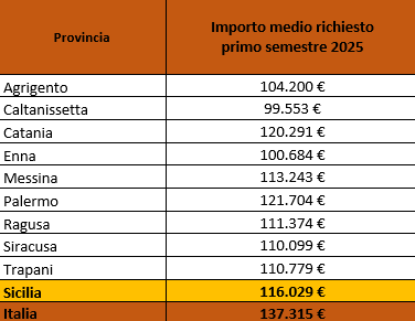 Chiudono la graduatoria regionale le province di Agrigento, dove la cifra media richiesta nel primo semestre dell’anno è stata pari a 104.200 euro, Enna (100.684 euro) e Caltanissetta (99.553 euro).