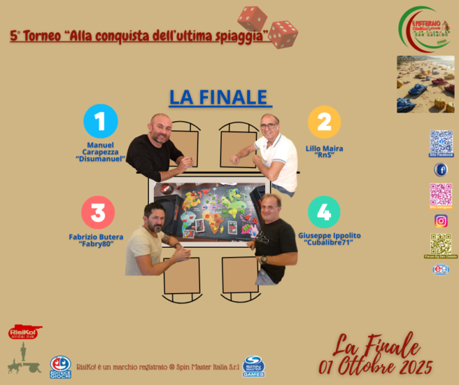 Mercoledì 24 e venerdì 26 settembre si sono svolte presso la Nuova Locanda di San Cataldo le 3 semifinali del 5° torneo interno “Alla conquista dell’ultima spiaggia”. I vincitori delle semifinali raggiungono così il finalista diretto Manuel Carapezza “Disumanuel”, del RCU “Eagles” di Palermo, nella finalissima che si svolgerà domani mercoledì 1 ottobre e che determinerà il vincitore del Torneo. In palio, oltre la vittoria del trofeo più ambito e tanti punti ranking per la classifica dei migliori giocatori del Club, anche la seconda wild card pass per la fase finale del Campionato Regionale Individuale di Risiko Sicilia “CRI 2025”, che vedrà il prossimo 12 ottobre 32 giocatori provenienti da tutti i club siciliani sfidarsi per il titolo di miglior giocatore di Risiko in Sicilia, in un grande Torneo organizzato proprio dal Risiko Club Ufficiale Sancataldese.