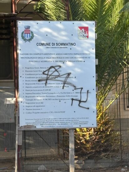 SOMMATINO. I consiglieri comunali di minoranza hanno avuto segnalata nei giorni scorsi la presenza di una svastica su un cartello posto davanti al centro sociale polivalente. La circostanza è già stata comunicata alle autorità competenti, che procederanno con gli accertamenti del caso. I consiglieri in una nota hanno affermato: “Riteniamo però indispensabile rimuovere al più presto questo simbolo nazista, lesivo dei nostri valori democratici e costituzionali, e ridare decoro a un luogo pubblico frequentato da tutta la comunità.