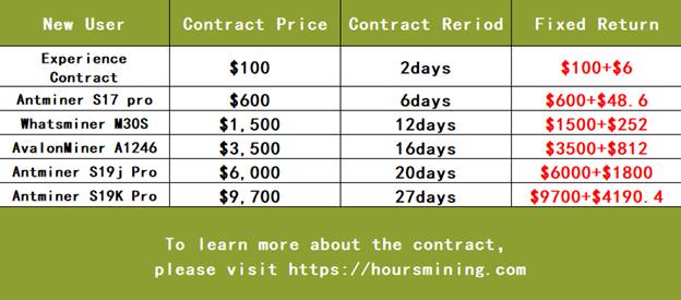 ② Purchase a Cloud Mining Contract: 8HOURSMining offers a variety of high-performance, high-yield contracts, each with varying hashrates and terms, resulting in varying returns.
