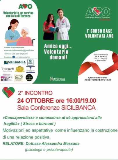 Il percorso formativo dell’Associazione Volontari Ospedalieri (AVO) prosegue con il suo secondo importante appuntamento, focalizzato su temi cruciali per chi opera, o desidera operare, nel settore dell’assistenza e delle relazioni d’aiuto. L’incontro si terrà venerdì 24 ottobre 2025 dalle ore 16:00 alle 19:00 presso la Sala Conferenze SICILBANCA.