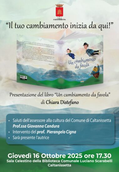 Il coraggio di cambiare, l’audacia di trasformarsi, la forza di maturare consapevolezza nell’affrontare continui percorsi evolutivi di crescita, cambiare per sentirsi liberi. Sono alcuni dei temi del libro “Un cambiamento da favola” di Chiara Distefano, insegnante di spagnolo negli istituti superiori, con esperienze nel teatro e nella musica (o nel canto), che si presenterà giovedì 16 ottobre alle ore 17.30 alla Sala Celestino della Biblioteca Comunale Scarabelli di Caltanissetta. Alla presentazione interverrà per un saluto l’assessora alla cultura del Comune di Caltanissetta Giovanna Candura, ed il prof. Pierangelo Cigna, che dialogherà con l’autrice.