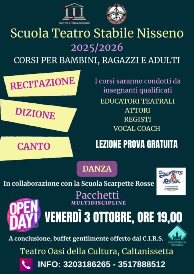 Lunedì 6 ottobre per il sedicesimo anno consecutivo partono all’Oasi della Cultura di Caltanissetta i corsi e i laboratori teatrali della scuola del Teatro Stabile Nisseno per l’anno accademico 2025/2026. Un impegno professionale costante negli anni premiato con la presenza di circa 80 allievi tra bambini, ragazzi, giovani e adulti a partire dal mese di ottobre 2025 sino al mese di maggio 2026 dove ogni classe effettuerà un saggio finale.