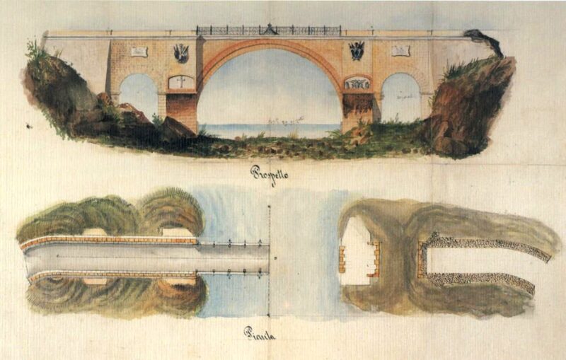 1. Il Ponte Capodarso, costruito sotto la signoria dei Moncada, quando dal 1547 al 1575 viceré di Sicilia era Juan de Vega y Enríquez de Acuña, fu presumibilmente progettato da Nicola Facenti e realizzato da maestranze veneziane nel 1553, come testimonia l’iscrizione dedicata all’imperatore Carlo V d’Asburgo. Il manufatto originario, a schiena d’asino, era composto da un unico arco, a tutto sesto, di metri 23,97, un’altezza sul pelo dell’acqua di metri 20,62 e una lunghezza di metri 29,12. Fu realizzato con grossi conci in pietra gialla di Sabucina (pietra locale calcarea) così come i muri laterali. Due contrafforti con una cornice in pietra delimitavano la grande arcata. Sulla riva nissena, inoltre, venne realizzato un ulteriore, piccolo arco.