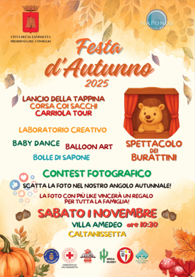 Con l’impulso della Presidenza del Consiglio, che ha voluto fortemente l’evento, il Comune di Caltanissetta organizza insieme all’associazione teatrale Naponos la 2^ edizione della “Festa dell’Autunno”, un evento aperto a tutti che si terrà sabato 1 novembre a partire dalle ore 10:30.