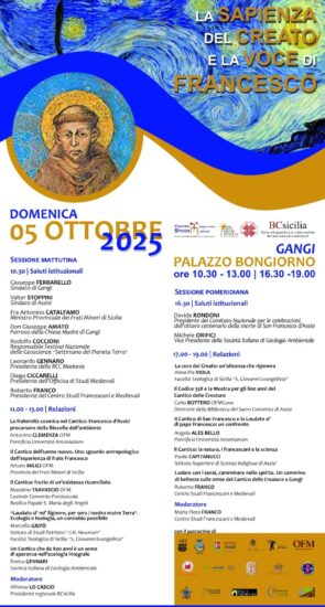 Alle ore 11 al via la giornata di studi con gli interventi di: Antonino Clemenza OFM Pontificia Università Antonianum; Arturo Milici OFM Provincia dei Frati Minori di Sicilia; Massimo Travascio OFM, Custode Convento Porziuncola Basilica Papale Santa Maria degli Angeli; Marcello Grifò, Istituto di Studi Patristici “J.H. Newman” – Facoltà Teologica di Sicilia “S. Giovanni Evangelista” e Enrico Gennari, società Italiana di Geologia Ambientale. Modera Alfonso Lo Cascio, presidente regionale Bcsicilia.