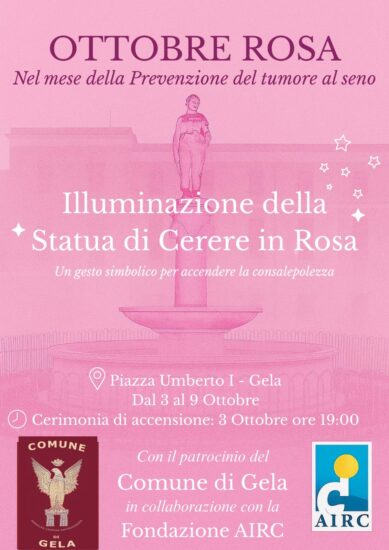 Il Comune di Gela, con il Sindaco Terenziano Di Stefano, l’assessore ai Servizi sociali e pari opportunità Valeria Caci, la Presidente del Consiglio comunale Paola Giudice e la Commissione consiliare Servizi sociali presieduta da Lorena Alabiso, in collaborazione con la Fondazione AIRC, è orgoglioso di promuovere l’iniziativa Ottobre Rosa – Illuminare la Prevenzione, un evento simbolico e di grande valore sociale volto a sensibilizzare la cittadinanza sull’importanza della prevenzione della salute della donna.