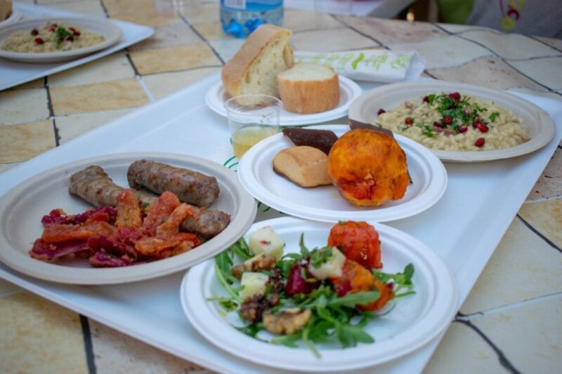 Dalle 12:00, sarà possibile degustare il menù completo che prevede ficodindia, cipolla rossa, capperi e acciughina, con olio e pepe, bruschetta con pesto di pala di ficodindia; riso con pancetta, mantecato al pecorino e succo di ficodindia, con rucola, melograno e scorza di limone; polpette con trito di maiale e di bucce di ficodindia; bucce fritte con farina di riso; biscotto e liquore al ficodindia; acqua e vino Tenuta dell’Abate. Ticket 13 Euro. Alternative al menu completo: panino con tonno fresco o con tagliata di manzo e maionese di ficodindia; panino con verdure grigliate, pane con salsiccia e bucce di ficodindia, panino con panelle, patatine, rosticceria. Menù senza glutine disponibile. Stoviglie plastic free.