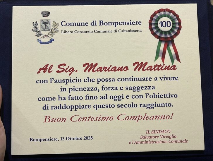 Alla cerimonia hanno preso parte le autorità locali: il sindaco di Bompensiere, Salvatore Virciglio, padrone di casa; la sindaca di Sutera, Giuseppina Catania, suo paese natale; e il sindaco di Milena, Claudio Salvatore Cipolla, dove oggi il centenario risiede. Presenti anche il presidente del Libero Consorzio Comunale di Caltanissetta, Walter Calogero Tesauro, e il vicesindaco del capoluogo, Giovanna Candura, che hanno portato il saluto e l’affetto di tutta la provincia.