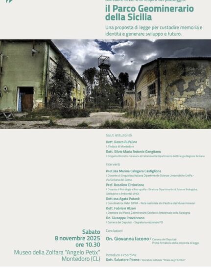MONTEDORO – L’On. Giovanna Iacono, prima firmataria della proposta di legge “Istituzione del Parco Geominerario della Sicilia”, promuove l’iniziativa pubblica dal titolo: “Dal cuore di zolfo al respiro del paesaggio: il Parco Geominerario della Sicilia. Una proposta di legge per custodire memoria e identità e generare sviluppo e futuro.” L’incontro si terrà sabato 8 novembre 2025 alle ore 10.30 presso il Museo della Zolfara “Angelo Petix” di Montedoro (Caltanissetta). Un incontro per discutere di una proposta di legge che mira a valorizzare uno dei patrimoni più autentici della Sicilia: la sua storia mineraria. Sarà un momento di confronto qualificato tra istituzioni, esperti, rappresentanti del mondo accademico e delle comunità locali, con l’obiettivo di approfondire i contenuti della proposta normativa e di valutarne le possibili ricadute in chiave giuridica, sociale, culturale ed economica. Il Parco Geominerario della Sicilia rappresenta un progetto strategico per la tutela della memoria storica del lavoro minerario, la valorizzazione del paesaggio e del patrimonio industriale dismesso, e la promozione di nuove opportunità di sviluppo sostenibile per i territori interni dell’isola. L’iniziativa si inserisce in un percorso condiviso di ascolto e partecipazione, volto a coniugare identità e innovazione, storia e futuro, nella prospettiva di un modello di crescita fondato sulla conoscenza e sulla cultura.