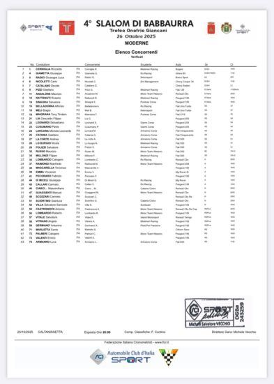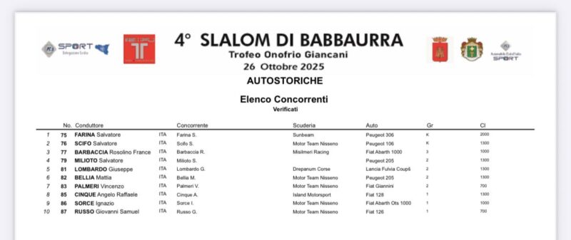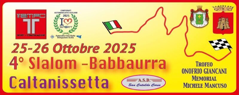 Concluse le consuete verifiche tecnico-sportive, saranno ben 62 (43 con auto moderne e otto con le storiche) i partecipanti attesi al via del 4° Slalom Babbaurra – Caltanissetta, penultimo appuntamento della Coppa 5^ zona nonché valido per il Campionato Siciliano Slalom, in programma domenica 26 ottobre.