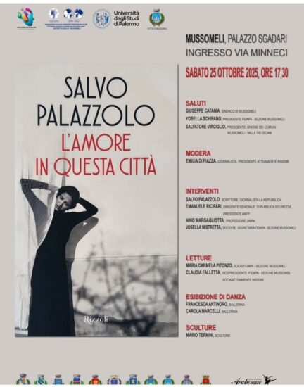 MUSSOMELI – Partecipato e seguito l’ evento, , svoltosi sabato 25 ottobre 2025 presso Palazzo Sgadari nato dalla collaborazione tra la sezione Fidapa di Mussomeli e l’ associazione Attivamente insieme. Presieduta dalla Presidente della sezione Fidapa Yosella Schifano la serata ha avuto inizio con i ringraziamenti agli intervenuti. Va subito detto che l’argomentare e l’intervento di Salvo Palazzolo, giornalista e scrittore, ha suscitato nel pubblico presente momenti ed elementi di riflessione sul tema trattato: “L’amore in questa città” . Anche la presidente dell’associazione AttivaMente Insieme, Emila Di Piazza, con la sua professionalità e visione culturale ha saputo coordinare e suscitare emozioni in un dialogo coinvolgente che ha reso l’incontro assai apprezzato. Non sono mancati i ringraziamenti ai relatori che hanno animato e arricchito il dibattito: Emanuele Ricifari, Dirigente Generale di Pubblica Sicurezza e Presidente ANFP; Nino Margagliotta, Professore UNIPA: Josella Mistretta, Docente e Segretaria FIDAPA Mussomeli. La serata è stata ulteriormente impreziosita dalle suggestive sculture dell’artista Mario Termini e dalle emozionanti esibizioni di danza di Francesca Antinoro e Carola Marcelli della scuola Arabesque, guidate da Alessandra Alfano e Veronica Cappalonga. A dare voce al libro le letture di Claudia Falletta e Maria Carmela Pitonzo. Presenti il Sindaco Giuseppe Catania, il Presidente dell’Unione dei Comuni Salvatore Virciglio, Alessandra Romano e Maurizio Messina e tanti altri che, con la loro presenza e il loro sostegno, hanno reso possibile questo importante incontro culturale.