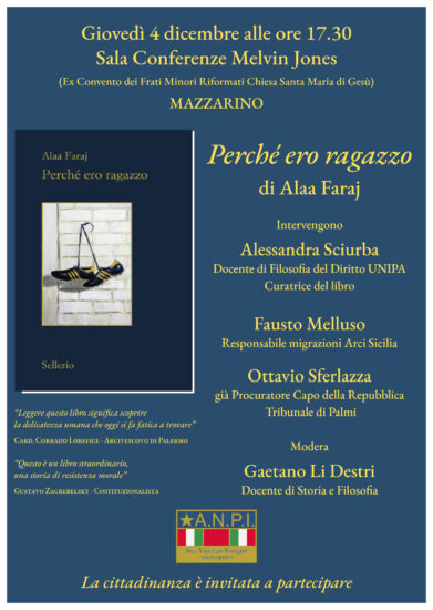 La sezione ANPI di Mazzarino organizza per giovedì, 4 dicembre, alle ore 17:30, nella sala conferenze Melvin Jones – ex convento dei FratiMinori Roformati Chiesa Santa Maria di Gesù – a Mazzarino, la presentazione del libro “Perché ero ragazzo” di Alaa Faraj, edito da Sellerio. L’appuntamento vedrà gli interventi di Alessandra Sciurba, docente di filosofia del Diritto all’Unipa e curatrice del libro; Fausto Melluso, responsabile migrazioni Arci Sicilia; Ottavio Sferlazza, già procuratore Capo della Repubblica di Palmi. A moderare la presentazione, Gaetano Li Destri, docente di storia e filosofia.