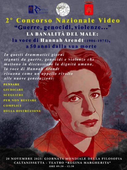 CALTANISSETTA – Dopo il successo della prima edizione dedicata al filosofo Immanuel Kant, torna il concorso nazionale che unisce filosofia e linguaggio audiovisivo quest’anno dedicato alla filosofa Hannah Arendt, l’iniziativa è rivolta alle studentesse e agli studenti delle scuole secondarie di secondo grado. In occasione della Giornata Mondiale della Filosofia, il prossimo 20 novembre nel teatro “Regina Margherita” di Caltanissetta si svolgerà la cerimonia di premiazione.