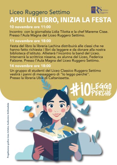 Per il decimo anno consecutivo il Liceo “R. Settimo”, diretto dalla prof.ssa Rossella Maria Rindone, partecipa all’iniziativa nazionale “#ioleggoperché”, volta a promuovere i libri e la lettura nelle scuole. Sono previste attività e incontri dal 10 al 14 novembre per incuriosire gli studenti e spingerli a frequentare le librerie, accostandosi al libro in modo personale e creativo.