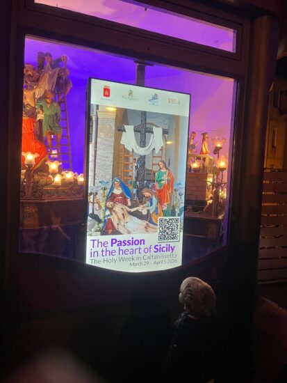 All’interno, su una delle vetrate del chiosco, è stato installato un monitor che proietta immagini e video dedicati alla Settimana Santa nissena, alternati a scorci e fotografie delle bellezze architettoniche e artistiche di Caltanissetta: chiese, musei e angoli del centro storico che raccontano la città nella sua interezza.