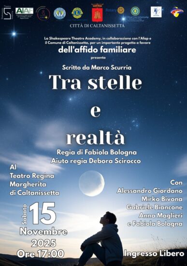 Si svolgerà dalle ore 17.00 del 15 novembre 2025, al teatro comunale “Regina Margherita” di Caltanissetta lo spettacolo teatrale “Tra stelle e realtà”. Un evento libero e gratuito, aperto alla cittadinanza, promosso dall’Assessore alle Politiche Sociali Ermanno Pasqualino, dal Servizio Sociale Professionale del Comune di Caltanissetta, gestito dall’Associazione Famiglie Affidatarie Project (AFAP) e la compagnia teatrale Shakespeare Theatre Academy, con la partecipazione dell’Associazione degli avvocati per la famiglia e minori della Regione Sicilia (AIAF).