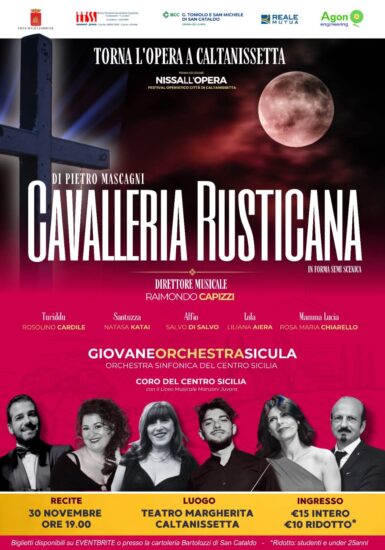 CALTANISSETTA – La lirica torna protagonista al Teatro Margherita con “Cavalleria Rusticana” di Pietro Mascagni, proposta in forma semi-scenica per la prima edizione del Festival operistico “Nissall’Opera”, un progetto che punta a riportare l’opera al centro della vita culturale cittadina. L’evento, patrocinato dal Comune di Caltanissetta, vedrà la direzione musicale del Maestro Raimondo Capizzi alla guida della Giovane Orchestra Sicula, orchestra sinfonica del Centro Sicilia.