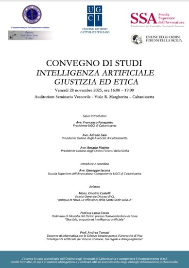 Promosso dall’Unione Giuristi Cattolici Italiani – sezione di Caltanissetta, presieduta dall’avv. Francesco Panepinto – il convegno gode del patrocinio del Consiglio dell’Ordine degli Avvocati, della Scuola Forense Nissena “G. Alessi”, della Scuola Superiore dell’Avvocatura e dell’Unione degli Ordini Forensi della Sicilia.