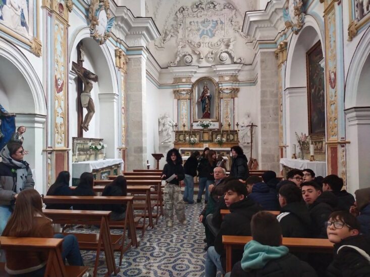 Come da programma, giovedì 27 novembre 2025, gli “apprendisti ciceroni” del triennio dell’indirizzo Turistico dell’IIS Hodierna, hanno animato per una intera mattinata il quartiere Terravecchia di Mussomeli. Le quattro classi dell’indirizzo Turistico hanno presentato le meraviglie dell’antico centro storico di Mussomeli, facendo da ciceroni ad altri studenti. Nonostante l’inclemenza delle condizioni metereologiche, che non hanno risparmiato acqua e gelo, quasi duecento studenti sono stati condotti alla scoperta delle chiese del quartiere più antico di Mussomeli: la chiesa della Madonna della Provvidenza, la chiesa di Santa Margherita, l’oratorio dell’Arciconfraternita del SS Sacramento e la chiesa di San Ludovico (Madrice). L’evento, organizzato dall’IIS Hodierna, ancora una volta ha visto la collaborazione sinergica del più antico Istituto di Istruzione Secondaria del territorio con la delegazione nissena del FAI, con l’Amministrazione Comunale di Mussomeli, con l’Arcipretura di Mussomeli e con l’Arciconfraternita della Madrice; a tal fine vanno sicuramente citati per la disponibilità e per la collaborazione, l’arciprete Padre Achille Lo Manto, l’assessore Gianluca Nigrelli, il priore dell’Arciconfraternita Alessio Barba e i tanti confrati che hanno offerto il loro prezioso supporto alla buona riuscita dell’iniziativa. La giornata ha permesso agli studenti “apprendisti ciceroni” di sperimentarsi in un’attività di alternanza scuola-lavoro “reale” e ha permesso alle centinaia di studenti-turisti di esplorare il patrimonio storico di Mussomeli presentato dalla voce dei loro poco più grandi compagni di studio, in un ormai consolidato esperimento di educazione tra pari all’insegna della comune crescita culturale.