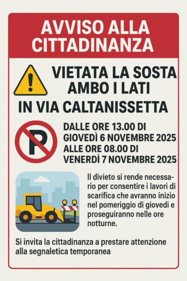 MUSSOMELI – L’Amministrazione Comunale informa la cittadinanza che, dalle ore 13.00 di giovedì 6 novembre 2025 e fino alle ore 08.00 di venerdì 7 novembre 2025, sarà vietata la sosta su ambo i lati di Via Caltanissetta. Il provvedimento si rende necessario per consentire l’esecuzione dei lavori di scarifica e manutenzione del manto stradale, che avranno inizio nel pomeriggio di giovedì e proseguiranno nelle ore notturne, al fine di ridurre al minimo i disagi alla circolazione. Si invita pertanto la cittadinanza a prestare attenzione alla segnaletica temporanea che verrà apposta lungo la via e a non lasciare i veicoli in sosta nell’area interessata, per permettere il regolare svolgimento dei lavori. L’Amministrazione Comunale si scusa per i disagi e ringrazia i cittadini per la collaborazione e la comprensione. Periodo del divieto: dalle ore 13.00 del 06/11/2025 alle ore 08.00 del 07/11/2025. Zona interessata: Via Caltanissetta (ambo i lati)