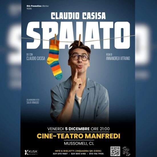 Il primo appuntamento è fissato per Venerdì 5 dicembre alle ore 21:00 dove nei locali del Cine-Teatro Manfredi si esibirà Claudio Casisa, comico noto ed ex membro del duo “I Soldi Spicci” che porterà il suo spettacolo dal titolo “Spaiato”