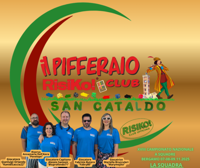 Dopo i saluti finali a conclusione della serata, 5 Pifferai (come vengono definiti i giocatori del Risiko Club Ufficiale “Il Pifferaio”) hanno iniziato ufficialmente i preparativi per il grande Campionato Nazionale a Squadre, che si svolgerà nel fine settimana prossimo 7-8-9 novembre a Bergamo, con la partecipazione di giocatori provenienti da 30 Risiko Club Ufficiali del Nord, Centro e Sud Italia, al termine del quale sarà eletta la squadra Regina per questa Edizione ormai arrivata al 28esimo anno di sfide tra i principali Club di Risiko italiani. Per la sua prima volta parteciperà anche il Risiko Club Ufficiale “Il Pifferaio” con 4 giocatori e una riserva, Alessio Sansoni (Capitano e 2 volte vice campione nazionale a squadre con i Risiko Club di Cagliari e Caltanissetta, e recente finalista e secondo classificato al Master Nazionale di Risiko di Palermo del 26 ottobre scorso), Mariella Brucculeri (recente 3° classificata al Campionato Regionale Sicilia 2025), Fabrizio Butera (recente finalista e terzo classificato al Master Nazionale di Risiko di Palermo del 26 ottobre scorso) e Gianluigi Orlando (che ha il pregio di non arrendersi mai sebbene sia da poco che gioca nel circuito del Risiko ufficiale). Come riserva Annamaria Dell’Aiera che è pronta a sostituire qualche giocatore titolare nel corso delle 3 partite che si disputeranno in caso di necessità.