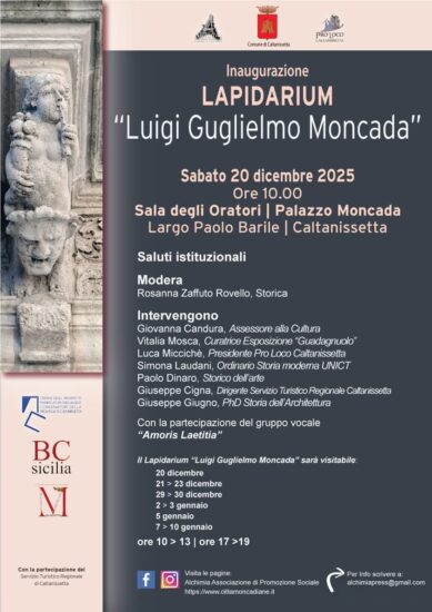 In questo nuovo spazio, infatti, i visitatori potranno scoprire, attraverso una selezione curata di reperti, le fasi di costruzione e trasformazione del Palazzo e la storia dei Moncada e dei loro territori: le “Città Moncadiane”. La sezione dedicata a Palazzo Moncada, simbolo indiscusso della città, ne racconta la storia con documenti e fotografie, dalla sua costruzione alla sua funzione storica come centro nevralgico delle istituzioni cittadine, fino al suo attuale utilizzo come sede museale. Inoltre, la sezione sulla storia delle città moncadiane esplora, attraverso testimonianze materiali e ricostruzioni storiche, il contesto socio-politico e culturale nel quale vissero i Moncada, ponendone in evidenza gli intrecci, le relazioni e i nessi nel panorama regionale. L’evento inaugurale, che si terrà il 20 dicembre 2025 alle ore 10.00, nella Sala degli Oratori di Palazzo Moncada e moderato dalla storica Rosanna Zaffuto Rovello, vedrà la partecipazione di autorità locali, esperti del settore e cittadini, in un momento di celebrazione collettiva della nostra storia. Dopo i Saluti istituzionali interverranno l’assessore alla cultura Giovanna Candura, la Curatrice dell’Esposizione “Guadagnuolo” Vitalia Mosca, il Presidente Pro Loco Caltanissetta Luca Miccichè, l’Ordinario Storia moderna UNICT Simona Laudani, lo Storico dell’arte Paolo Dinaro, il Dirigente del Servizio Turistico Regionale Caltanissetta Giuseppe Cigna e il Presidente di Alchimia e PhD Storia dell’Architettura Giuseppe Giugno.