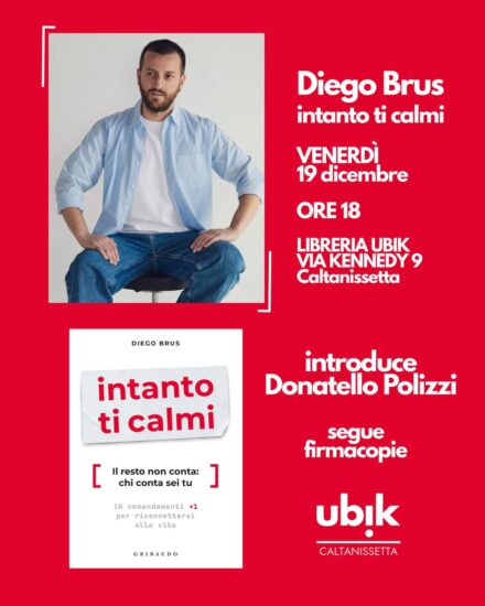 Rallentare. Respirare. Ascoltarsi. In un tempo dominato dalla fretta e dalla sovrastimolazione, Intanto ti calmi si propone come un invito concreto e necessario a ritrovare equilibrio e autenticità. Venerdì 19 dicembre, alle ore 18, nella Libreria Ubik di Caltanissetta (via Kennedy 9), Diego Brus presenterà il suo primo libro, pubblicato da Gribaudo del gruppo Feltrinelli. A introdurre l’incontro sarà Donatello Polizzi; a seguire, firmacopie.