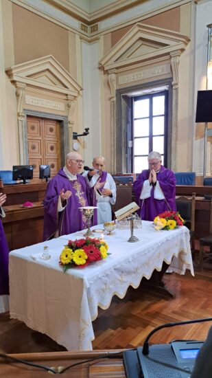 Questa mattina il Vescovo della Diocesi di Caltanissetta, Mons. Mario Russotto, ha celebrato una funzione religiosa nell’aula consiliare di Palazzo del Carmine dedicata ai dipendenti del Comune di Caltanissetta, al segretario generale Cinzia Chirieleison e degli organi politici. Hanno partecipato, tra gli altri, il sindaco Walter Tesauro, la Giunta Comunale, il presidente del Consiglio Comunale Gianluca Bruzzaniti, il vicepresidente Federica Scalia e alcuni consiglieri comunali.