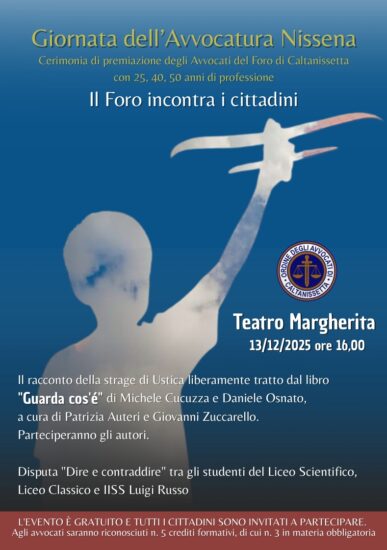 Quest’anno l’Avvocatura nissena vuole incontrare e coinvolgere i propri concittadini che sono invitati a partecipare, per cui la cerimonia avrà luogo presso il Teatro Regina Margherita in data 13 dicembre 2025 alle ore 16:00. E oltre alle premiazioni si potrà assistere al racconto della strage di Ustica a cura degli attori Patrizia Auteri e Giovanni Zuccarello, liberamente tratto dal libro “Guarda cos’é” del giornalista e conduttore Michele Cucuzza e dell’Avv. Daniele Osnato, che parteciperanno all’evento.