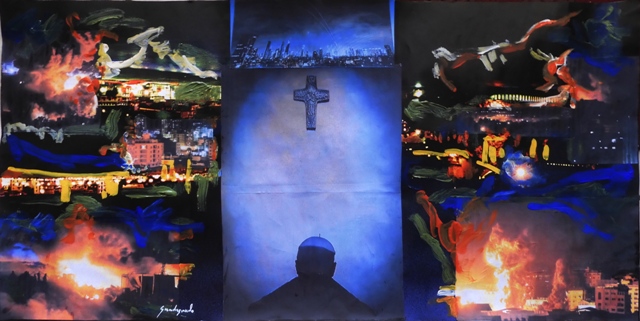Prima che il suo nome attraversasse l’oceano, Guadagnuolo intraprese un viaggio che non era solo geografico, ma iniziatico. Ogni città che lo accolse divenne un maestro silenzioso, un tempio in cui apprendere un frammento di verità. A Vienna, la città che respira musica e rigore, Guadagnuolo imparò che la forma è un tempio. Che ogni linea è un atto di responsabilità. Che la bellezza non è ornamento, ma ordine. A Parigi, scoprì che l’arte è anche ribellione. Che il colore può essere un grido. Che la visione può rompere le regole per crearne di nuove. A Londra, dove passato e futuro convivono come due sentinelle sulla stessa soglia, comprese che ogni opera è un ponte tra epoche. Che l’arte è memoria e profezia insieme. A Berlino, città di cicatrici e resurrezioni, imparò che la bellezza può sorgere dalle rovine. Che la memoria non è un peso, ma una promessa. E infine Varsavia, la città che custodisce la fede come una fiamma nel vento. Lì dedicò un’intera mostra a San Giovanni Paolo II. Non cercava il ritratto, ma la presenza. Non la somiglianza, ma la vibrazione spirituale. Il Cardinale Stanisław Dziwisz riconobbe in quelle opere una verità che non appartiene alla storia, ma alla memoria dell’umanità. Chi entrava in quella mostra non vedeva immagini: incontrava un’anima. Varsavia fu per Francesco Guadagnuolo non una tappa, ma una rivelazione. Poi venne New York. La città che non dorme, la città che giudica, la città che consacra. Alle Nazioni Unite, una sua opera dedicata al Debito Estero venne scelta per essere esposta permanentemente, accanto ai lavori di Manzù e Pomodoro. In quell’opera, la responsabilità globale non era un tema: era una ferita. Una ferita che attraversa popoli, epoche, coscienze. E così, il ragazzo partito da Caltanissetta vide la sua voce risuonare nel cuore della diplomazia mondiale. Con il tempo, Guadagnuolo divenne una delle voci più riconoscibili del Transrealismo Italiano. Un movimento che non separa il reale dal trascendente, ma li intreccia come fili di un’unica trama. Nelle sue opere: • il visibile è un simbolo • l’invisibile è una presenza • la materia è un varco • la luce è un destino. Le sue tele non rappresentano: rivelano. Non descrivono: invocano. Non imitano: trasfigurano.