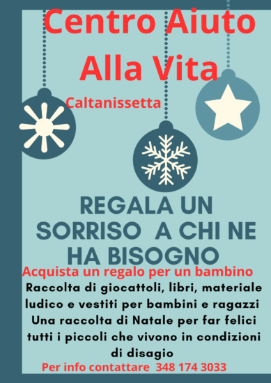 Chiunque voglia aderire all’iniziativa può acquistare un regalo da donare per una fascia di età dagli 0 ai 12 anni. Il regalo deve essere consegnato ai volontari del Centro di Aiuto Alla Vita di Caltanissetta entro il 22 dicembre e già incartato, indicando età e tipologia di regalo (esempio: puzzle, bambola, libro,ecc).