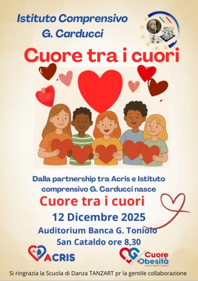 San Cataldo. Domani, 12 dicembre, presso l’Auditorium Toniolo, andrà in scena “Cuore tra i Cuori”, lo spettacolo tratto dal progetto “Cuore e Obesità”, un percorso di prevenzione cardiometabolica avviato lo scorso settembre presso l’Istituto Comprensivo “G. Carducci”.