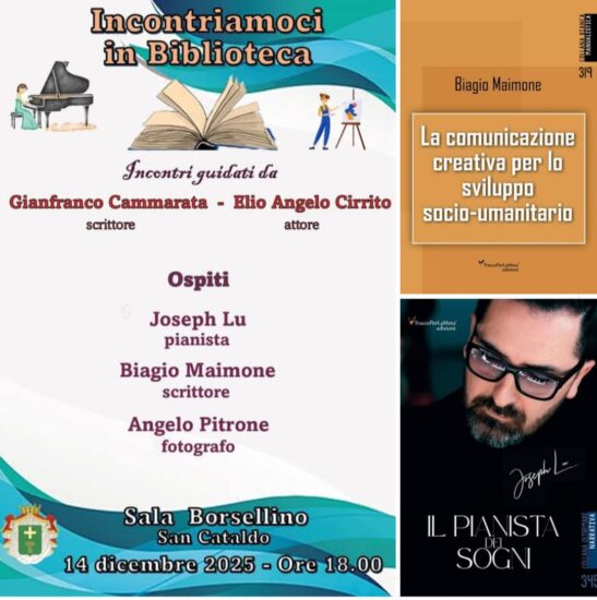 Il dialogo interreligioso e interculturale, cardine del volume, assume qui un significato particolare: la Sicilia, da secoli terra di incroci, di contaminazioni e di eroiche sintesi culturali, diventa sfondo ideale per un saggio che invita a superare l’isolamento comunicativo tipico del mondo digitale, recuperando una dimensione comunitaria e inclusiva.La presentazione sarà moderata dalla Prof.ssa Enza Spagnolo, critica letteraria e curatrice editoriale, la cui conduzione offrirà una lettura rigorosa della struttura concettuale dell’opera, inserendola nel contesto delle attuali teorie sociologiche e dei paradigmi culturali contemporanei. A seguire, l’appuntamento sarà impreziosito dall’intervento dell’Ospite Speciale Joseph Lu, compositore e pianista siciliano conosciuto come “Il Pianista dei Sogni”, figura artistica di grande intensità espressiva. La dimensione onirica, nucleo generativo della sua musica, si lega profondamente alla tradizione immaginifica siciliana, la stessa che ha nutrito la fantasia letteraria dei grandi del Novecento. Lu proporrà una testimonianza in cui il sogno si fa linguaggio, ponte emotivo e visivo, come nel celebre brano “Oniric”, candidato ai World Entertainment Awards (WEA). La sua opera si distingue anche per un forte impegno sociale, evidente nella composizione “Power of Love”, dedicata all’autismo, che conferma come l’arte possa farsi strumento di coscienza, di dialogo e di responsabilità civile.La serata sarà ulteriormente arricchita dall’esposizione delle fotografie di Angelo Pitrone, autore attento e raffinato, la cui presenza aggiunge profondità visiva a un evento che si configura come incontro polifonico tra parola, immagine e musica.“Incontriamoci in Biblioteca”, nella sua visione e nel suo impianto culturale, ribadisce la centralità della cultura come bene comune e come strumento di rigenerazione sociale. In questa prospettiva, l’appuntamento di San Cataldo si inserisce nel più ampio sforzo della Sicilia di affermarsi non solo come custode della propria tradizione, ma come laboratorio vivo e dinamico di nuove forme di espressione artistica e intellettuale.